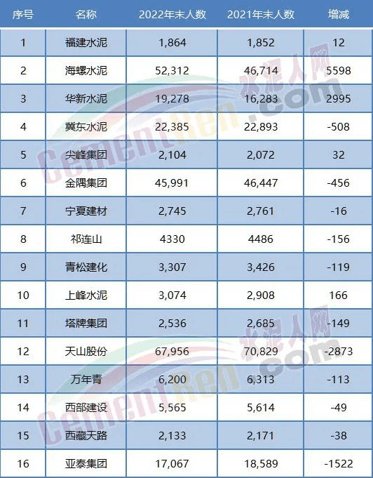 據上市企業(yè)公開數據,從2019~2022年金隅集團、冀東水泥、亞泰集團員工都有千人以上的減員,萬年青、祁連山、塔牌水泥均有百人以上的減員。2021~2022年金隅集團、冀東水泥、萬年青、祁連山、塔牌集團、青松建化等均有百人以上的減員,冀東水泥減員達500多人。然而,從水泥行業(yè)未來發(fā)展來看,這才是剛剛開始。