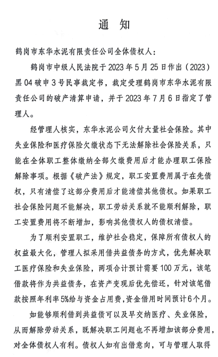 鶴崗市東華水泥有限責任公司申請破產(chǎn),欠付大量社會保險,預(yù)借款100萬元