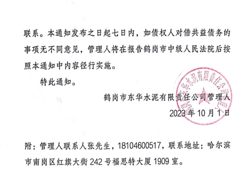 鶴崗市中級人民法院已于今年5月裁定受理鶴崗市東華水泥有限責任公司的破產(chǎn)清算申請,并于2023年7月6日指定了管理人。