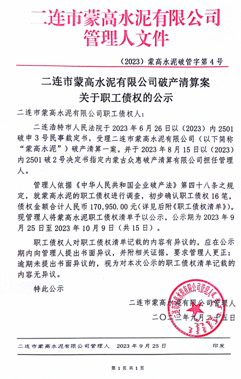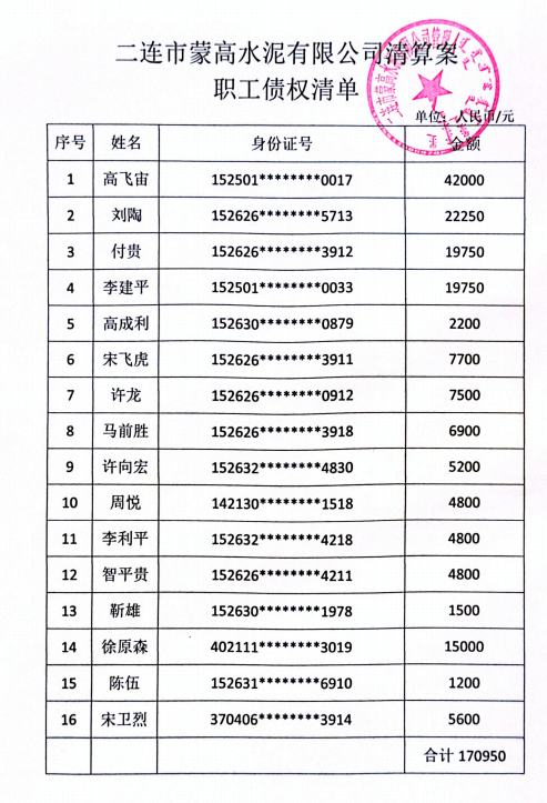 二連市蒙高水泥有限公司破產(chǎn),管理人初步確認職工債權(quán)16筆債權(quán)金額合計人民幣170,950.00元。
