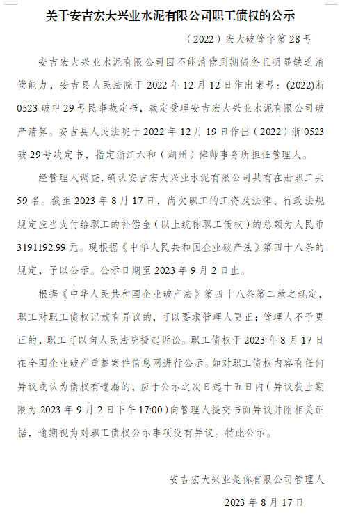 8月17日,安吉宏大興業(yè)水泥有限公司管理人發(fā)公示消息稱,經(jīng)調(diào)查確認安吉宏大興業(yè)水泥有限公司共有在冊職工共59名。截至2023年8月17日,尚欠職工的工資及法律、行政法規(guī)規(guī)定應(yīng)當支付給職工的補償金(以上統(tǒng)稱職工債權(quán))的總額為人民幣3191192.99元。