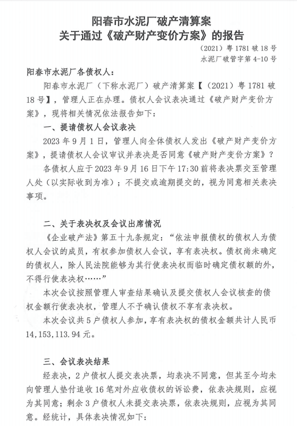 陽春市水泥廠破產(chǎn)清算,債務(wù)人3:2通過《破產(chǎn)財產(chǎn)變價方案》的報告