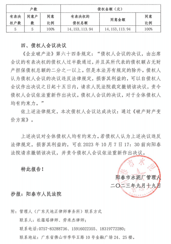 陽春市水泥廠共5戶債權(quán)人參加,享有表決權(quán)的債權(quán)金額共計人民幣14,153,113.94元。經(jīng)表決,2戶債權(quán)人提交表決票,均表決不同意,但其至今均未向管理人墊付追收16筆對外應(yīng)收債權(quán)的訴訟費。依表決規(guī)則,應(yīng)視為其同意。剩余3戶債權(quán)人未提交表決票,依表決規(guī)則,應(yīng)視為其同意。