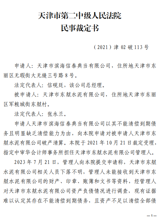 2023年7月21日,管理人向天津市第二中級人民法院提交申請稱,天津市東堼水泥有限公司相關(guān)人員下落不明,管理人未能接收到天津市東堼水泥有限公司的財產(chǎn)、印章、賬簿和文書等資料,經(jīng)管理人依法對天津市東堼水泥有限公司的資產(chǎn)負債情況進行調(diào)查,該廠仍有資產(chǎn),現(xiàn)難以認定其存在破產(chǎn)原因。法院于8月2日裁定駁回天津市濱海信泰典當有限公司對天津市東堼水泥有限公司的破產(chǎn)清算申請。