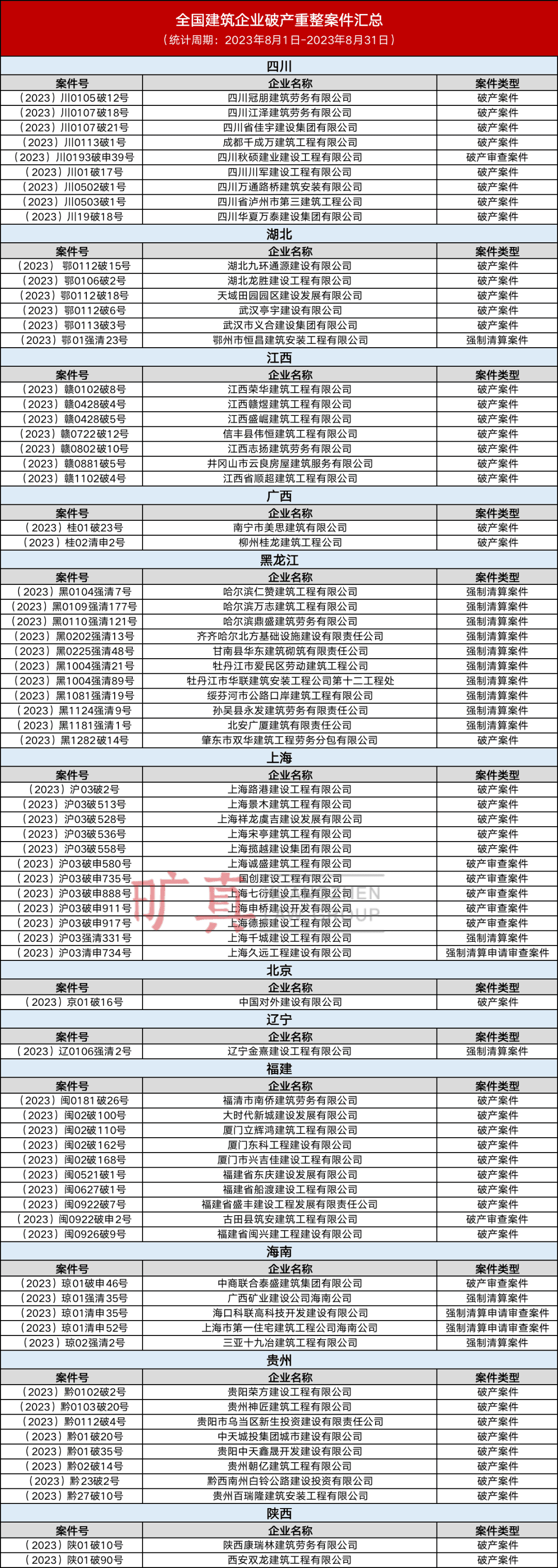 2023年8月全國建筑企業(yè)破產(chǎn)重整案件
