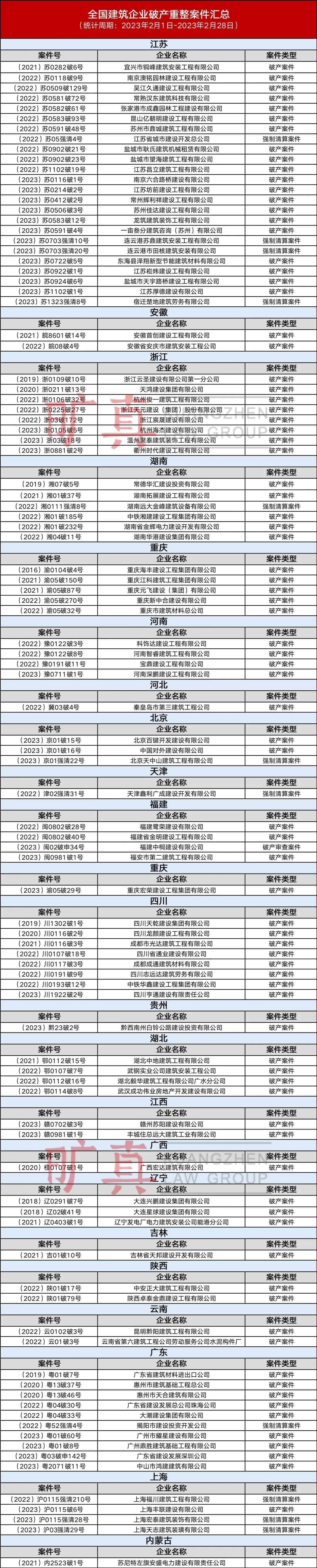 2023年2月全國建筑企業(yè)破產(chǎn)重整案件匯總