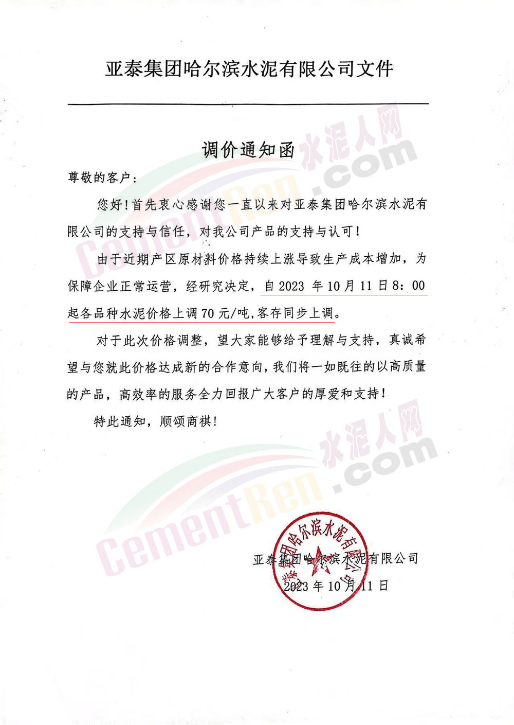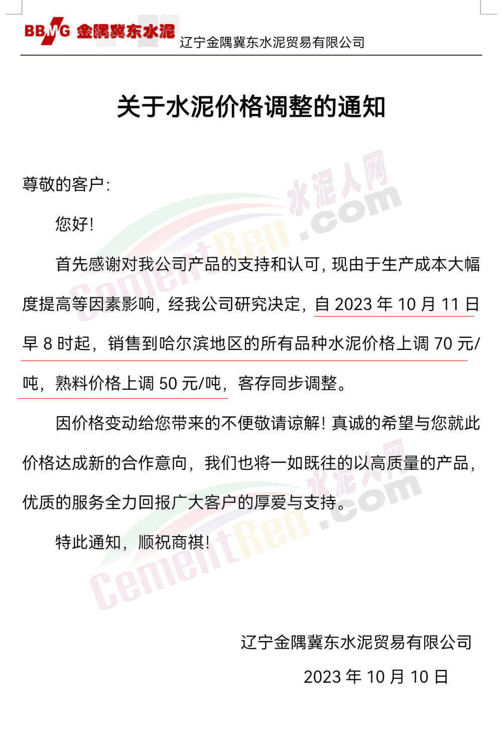 黑龍江區(qū)域主要品牌企業(yè)亞泰水泥、北方水泥以及遼寧金隅冀東發(fā)往黑龍江區(qū)域的水泥、熟料報(bào)價(jià)上調(diào)50-70元/噸。