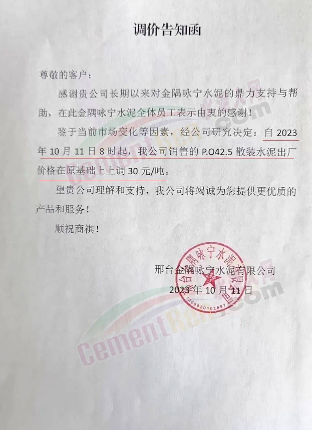京津冀地區(qū),北京金隅水泥石家莊分公司、邢臺(tái)金隅冀東水泥有限公司、邢臺(tái)金隅詠寧水泥有限公司等主要品牌企業(yè)通知上調(diào)水泥、熟料報(bào)價(jià)30元/噸。