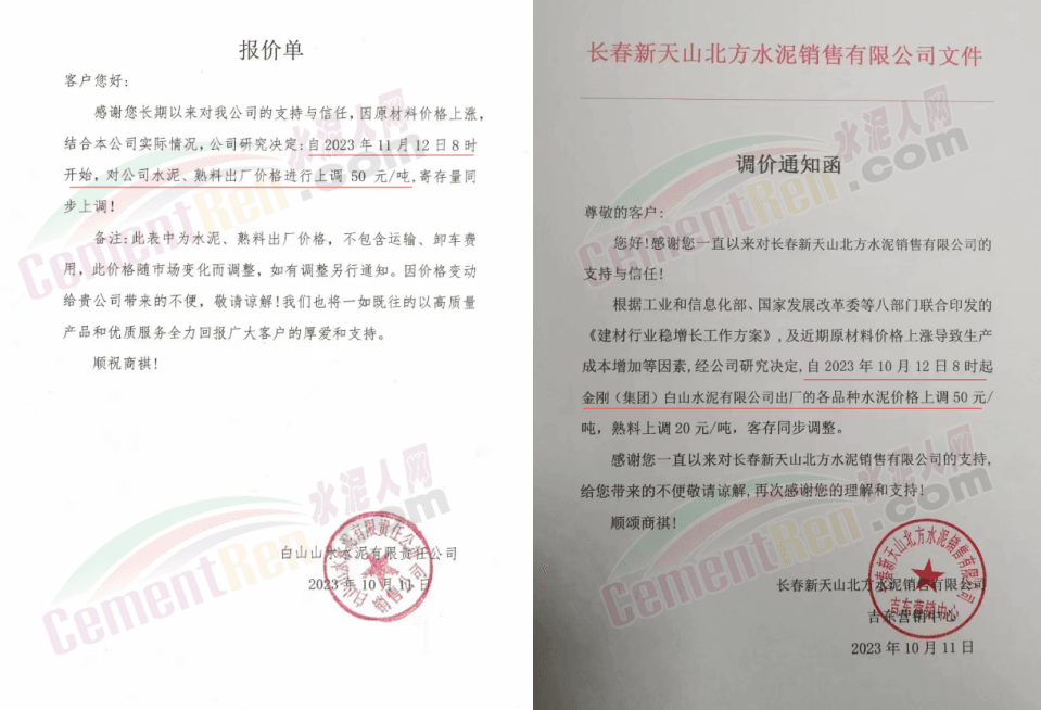 遼寧某混凝土企業(yè)通知,因水泥漲價(jià),混凝土報(bào)價(jià)上調(diào)10元/噸。