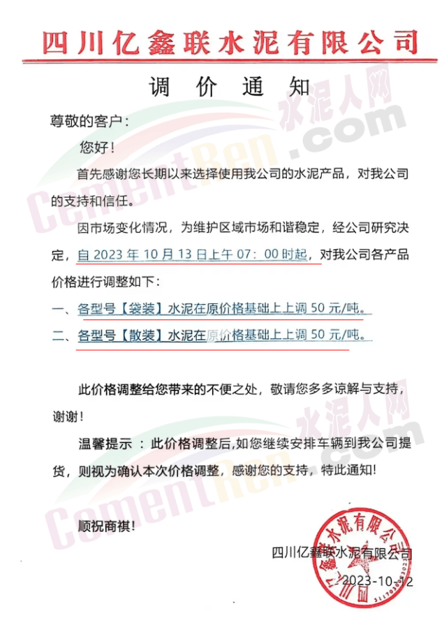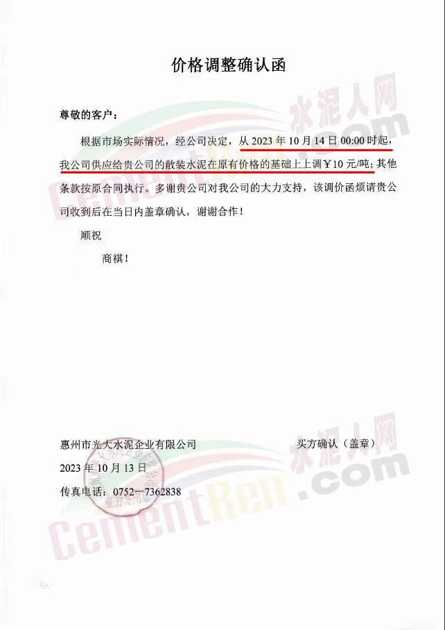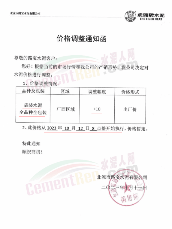 梅州市塔牌營(yíng)銷(xiāo)有限公司通知,經(jīng)惠州塔牌水泥有限公司授權(quán)通知,自2023年10月14日零時(shí)起,惠塔公司所有品種強(qiáng)度等級(jí)散裝水泥分別在原有出廠(chǎng)結(jié)算單價(jià)基礎(chǔ)上上調(diào)10元/噸。