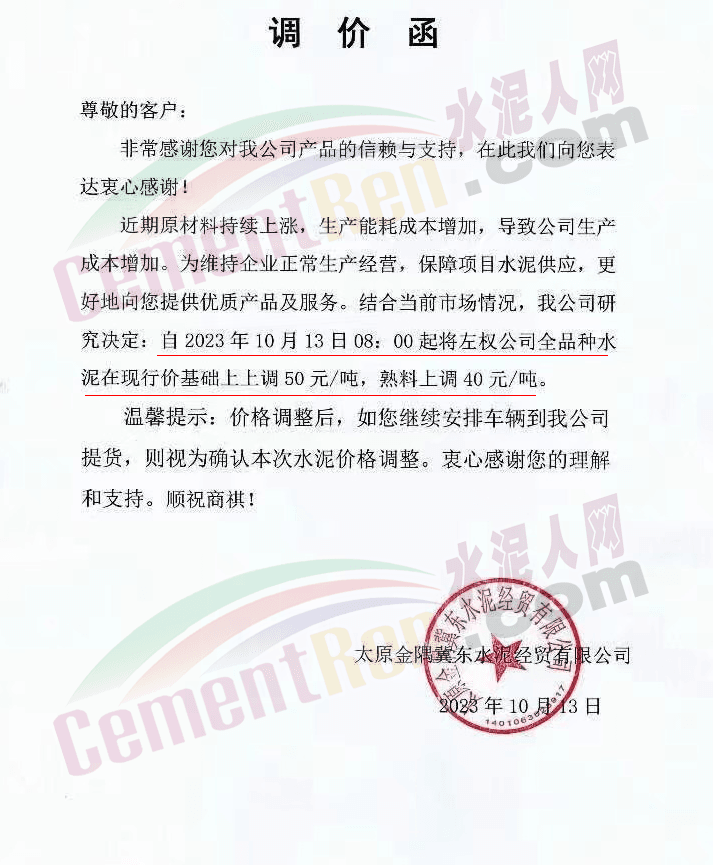 日前,山西太原金隅冀東水泥經(jīng)貿(mào)有限公司通知稱(chēng),近期原材料持續(xù)上漲,生產(chǎn)能耗成本增加,導(dǎo)致公司生產(chǎn)成本增加。為維持企業(yè)正常生產(chǎn)經(jīng)營(yíng),結(jié)合當(dāng)前市場(chǎng)情況,公司研究決定,自2023年10月13日08:00起將左權(quán)公司全品種水泥在現(xiàn)行價(jià)基礎(chǔ)上上調(diào)50元/噸,熟料上調(diào)40元/噸。自12時(shí)起將陽(yáng)泉、晉中太原區(qū)域PO425散裝水泥在現(xiàn)行價(jià)基礎(chǔ)上上調(diào)30元/噸,熟料上調(diào)40元/噸。