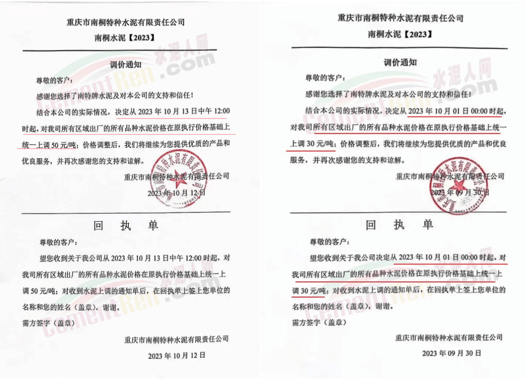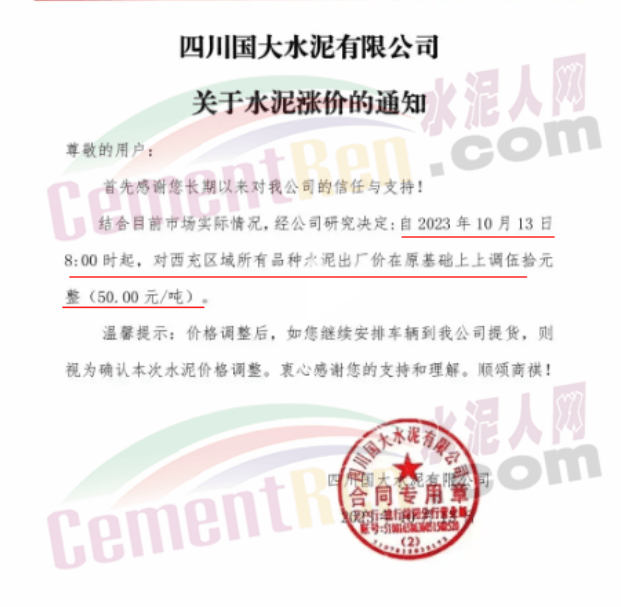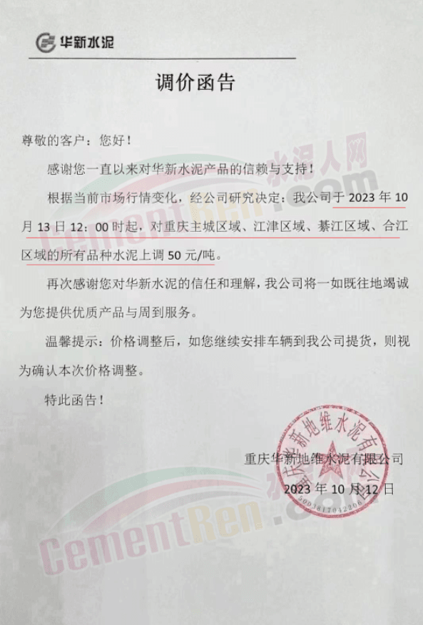 同日,川渝區(qū)域華新、西南、富豐、小南海等多家品牌水泥通知上調(diào)水泥報(bào)價(jià)50元/噸。