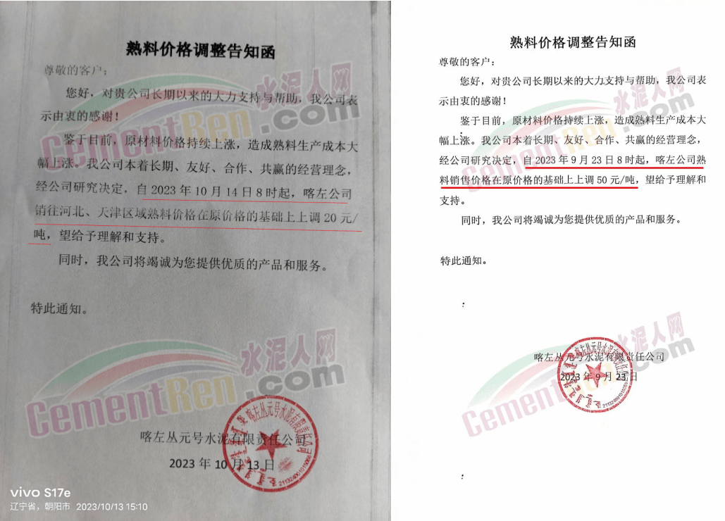遼寧區(qū)域山水水泥子公司喀左叢元號(hào)水泥有限公司,繼9月份連漲三次后,再次通知10月14日起,上調(diào)銷(xiāo)往河北、天津區(qū)域熟料報(bào)價(jià)20元/噸,四次累計(jì)上調(diào)達(dá)100元/噸。