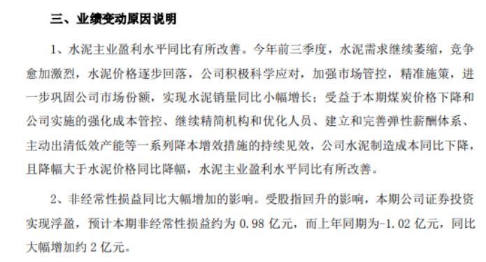 公司業(yè)績預增原因中提及受益于煤炭價格下降和公司實施的強化成本管控、繼續(xù)精簡機構和優(yōu)化人員、建立和完善彈性薪酬體系、主動出清低效產(chǎn)能等一系列降本增效措施的持續(xù)見效,公司水泥制造成本同比下降,且降幅大于水泥價格同比降幅,水泥主業(yè)盈利水平同比有所改善。