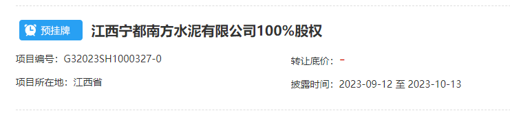 日前,江西南方水泥有限公司100%控股企業(yè)江西寧都南方水泥有限公司100%股權在某交易平臺公布預掛牌。