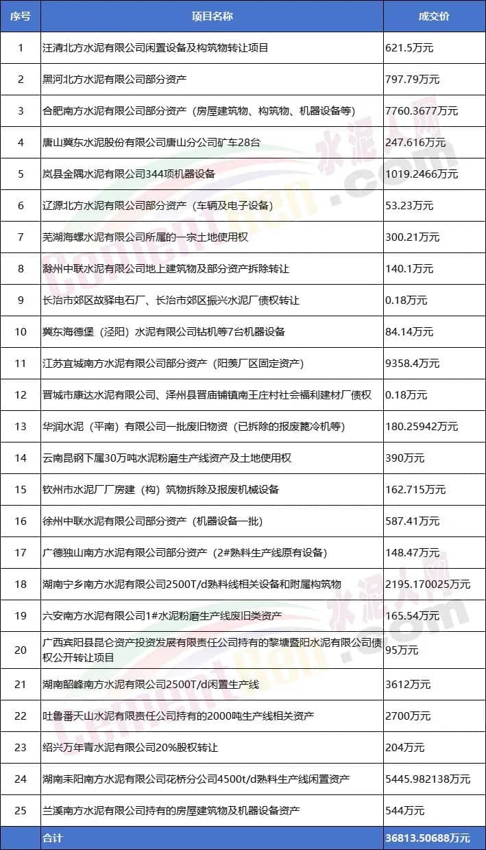今年以來已成交的22個項目中不僅包含閑置的設備及構筑物,土地使用權,還包括整條生產(chǎn)線以及相關企業(yè)的股權、債權。其中蕪湖海螺水泥有限公司所屬的一宗土地使用權以300.21萬元成交;湖南耒陽南方水泥有限公司花橋分公司4500t/d熟料生產(chǎn)線閑置資產(chǎn)以5445.982138萬元成交;紹興萬年青水泥有限公司20%股權以204萬元成交。云南昆鋼下屬30萬噸水泥粉磨生產(chǎn)線資產(chǎn)及土地使用權,以390萬元成交。已成交的25個項目成交金額合計3.68億元。