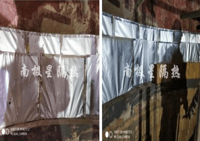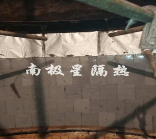 施工中,35mm納米隔熱板分兩層施工,一層25mm粘貼于鋼殼上,然后施工10mm的隔熱氈,兩層隔熱板錯(cuò)縫施工。采用35mm納米隔熱板代替100mm的硅酸鈣板,內(nèi)部直徑增加130mm,容積增加了32立方米,外殼溫度由原來的120℃下降到80℃,降溫幅度為40℃,擴(kuò)容和節(jié)能效果明顯,同時(shí)50天就收回了投資。