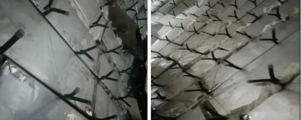 四川宏云建材采用10mm950型+50mm1000型納米隔熱板對(duì)分解爐進(jìn)行擴(kuò)容改造,改造后減薄隔熱層55mm,擴(kuò)容33立方米,秋季外殼溫度85℃,增產(chǎn)熟料99t/d,投入40天后就收回了投資,擴(kuò)容增產(chǎn)效益高,回收期短。