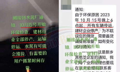 河南水泥企業(yè)通知,由于環(huán)保原因2023年10月15日晚上6點(diǎn)起,所有車輛停運(yùn)、建材企業(yè)停產(chǎn)。