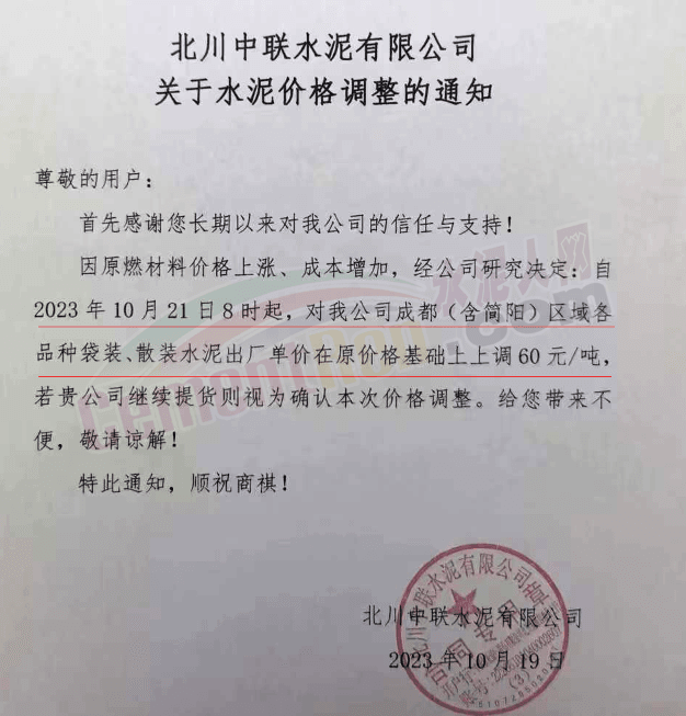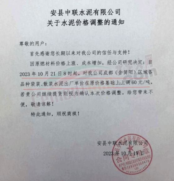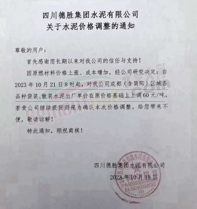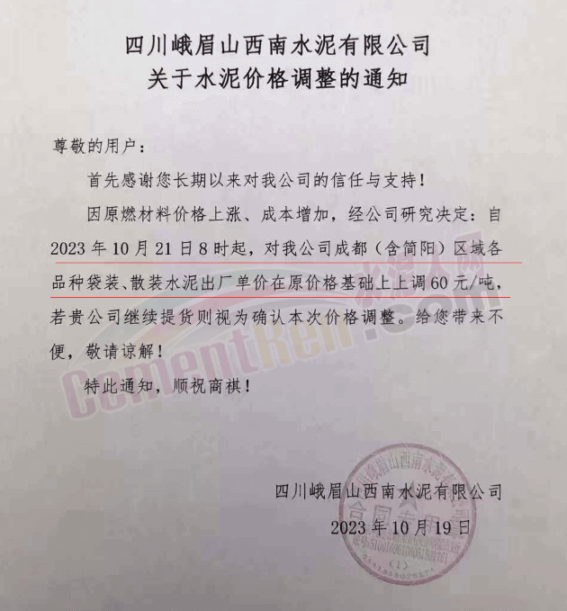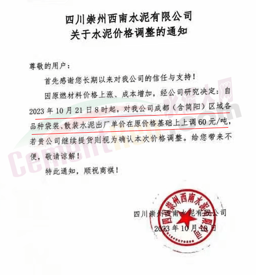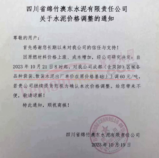 水泥人網通訊員消息:日前,四川大成都區(qū)域主要品牌企業(yè)通知自2023年10月21日起上調各品種水泥出廠價60元/噸。