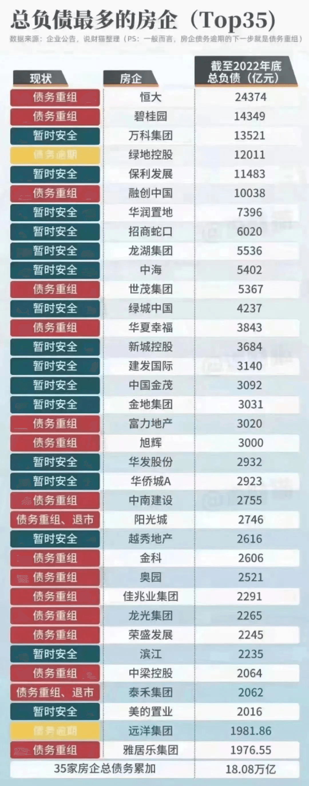 從碧桂園到融創(chuàng)再到綠地、華夏幸福、世茂地產(chǎn)、陽(yáng)光城,統(tǒng)計(jì)數(shù)據(jù)顯示,中國(guó)房企排名前100中,53家已暴雷或正處于暴雷邊緣,房企前30強(qiáng)已經(jīng)暴雷20家,不知下一家會(huì)是誰(shuí)。負(fù)債萬(wàn)億的房企有4家,分別為,恒大、碧桂園、萬(wàn)科、綠地控股,由此可見(jiàn),就連一向以經(jīng)營(yíng)穩(wěn)健著稱(chēng)的萬(wàn)科,目前也存在債務(wù)暴雷風(fēng)險(xiǎn)。