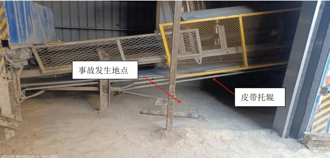經(jīng)現(xiàn)場勘查、問詢,查閱資料,初步分析,該工人清理積料時進(jìn)入運(yùn)轉(zhuǎn)的皮帶機(jī)下部,由于該部位高度較低(1.05米),周圍較為狹窄,在用手持刮板工具清理積料時,右臂肘部被卷入下部皮帶托輥與皮帶之間,進(jìn)而帶動身體回轉(zhuǎn),造成頭部被卷入托輥與皮帶之間,導(dǎo)致事故發(fā)生。