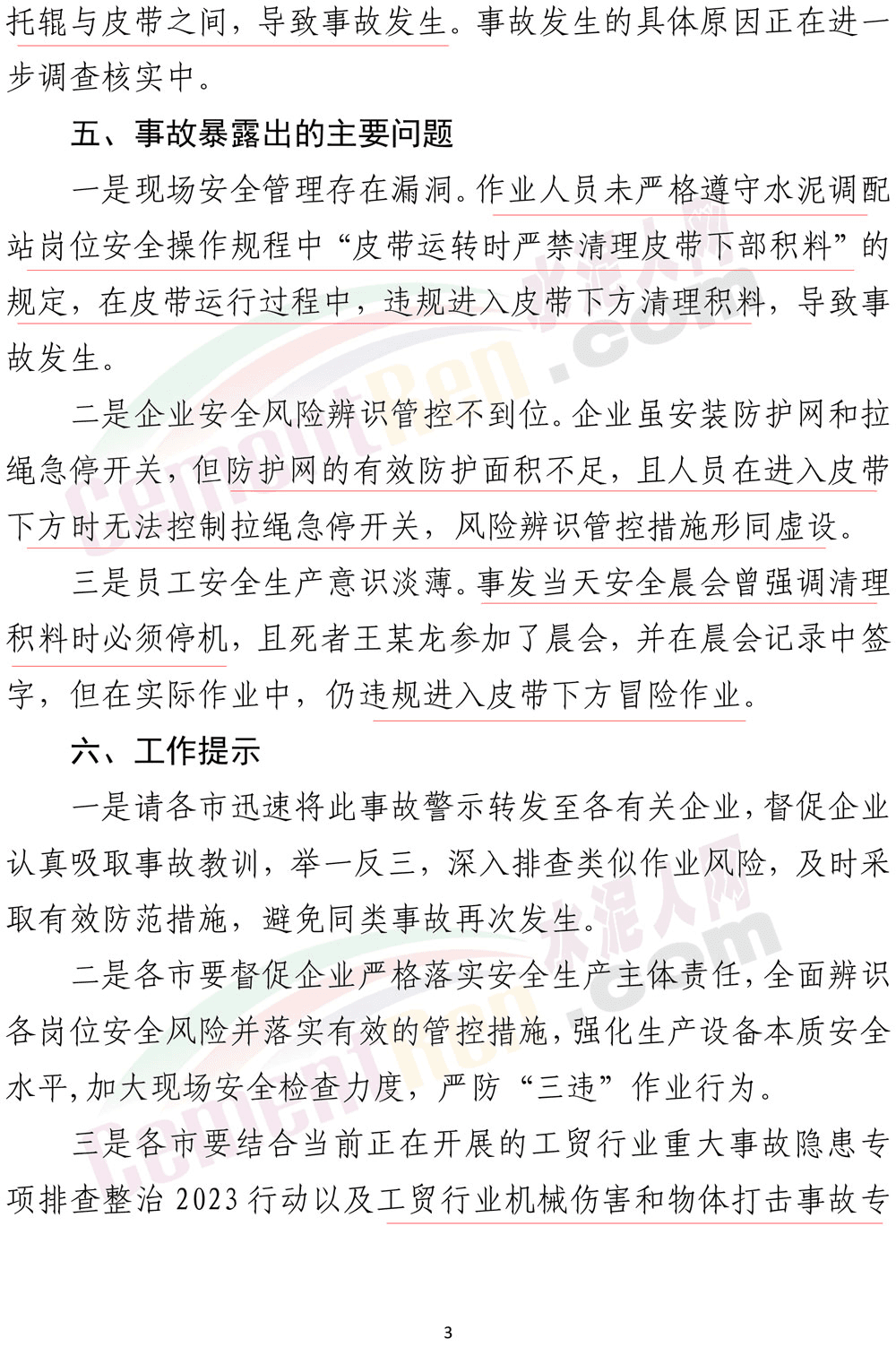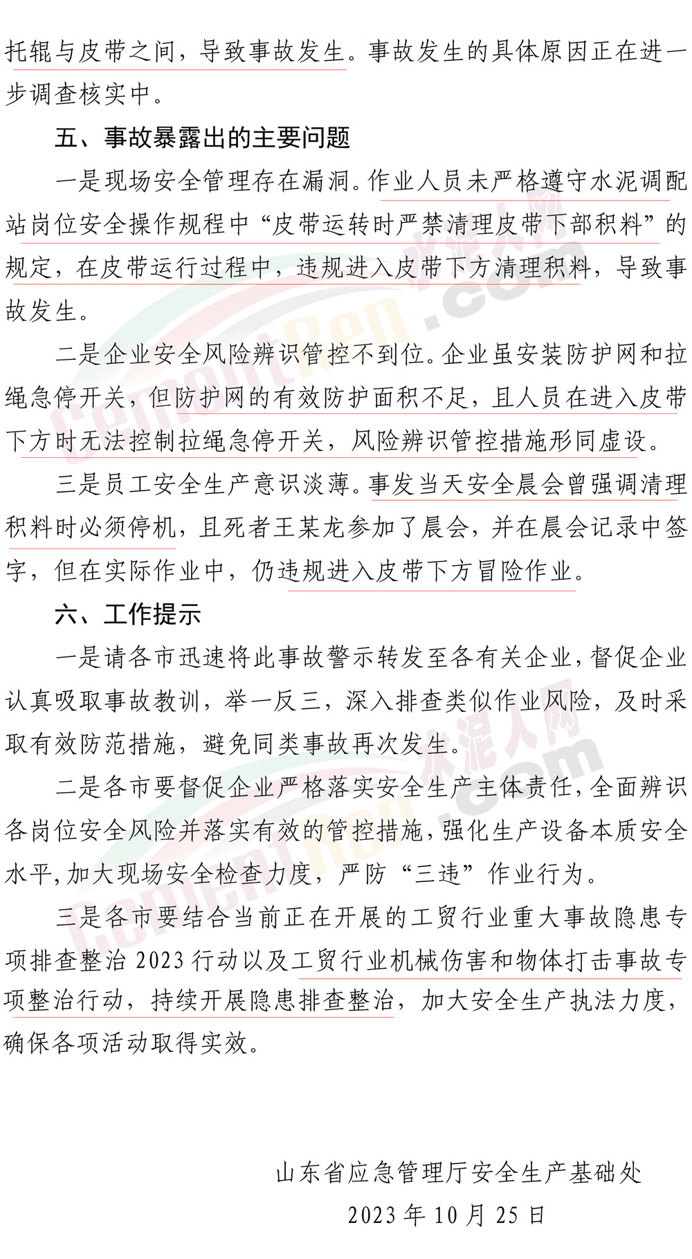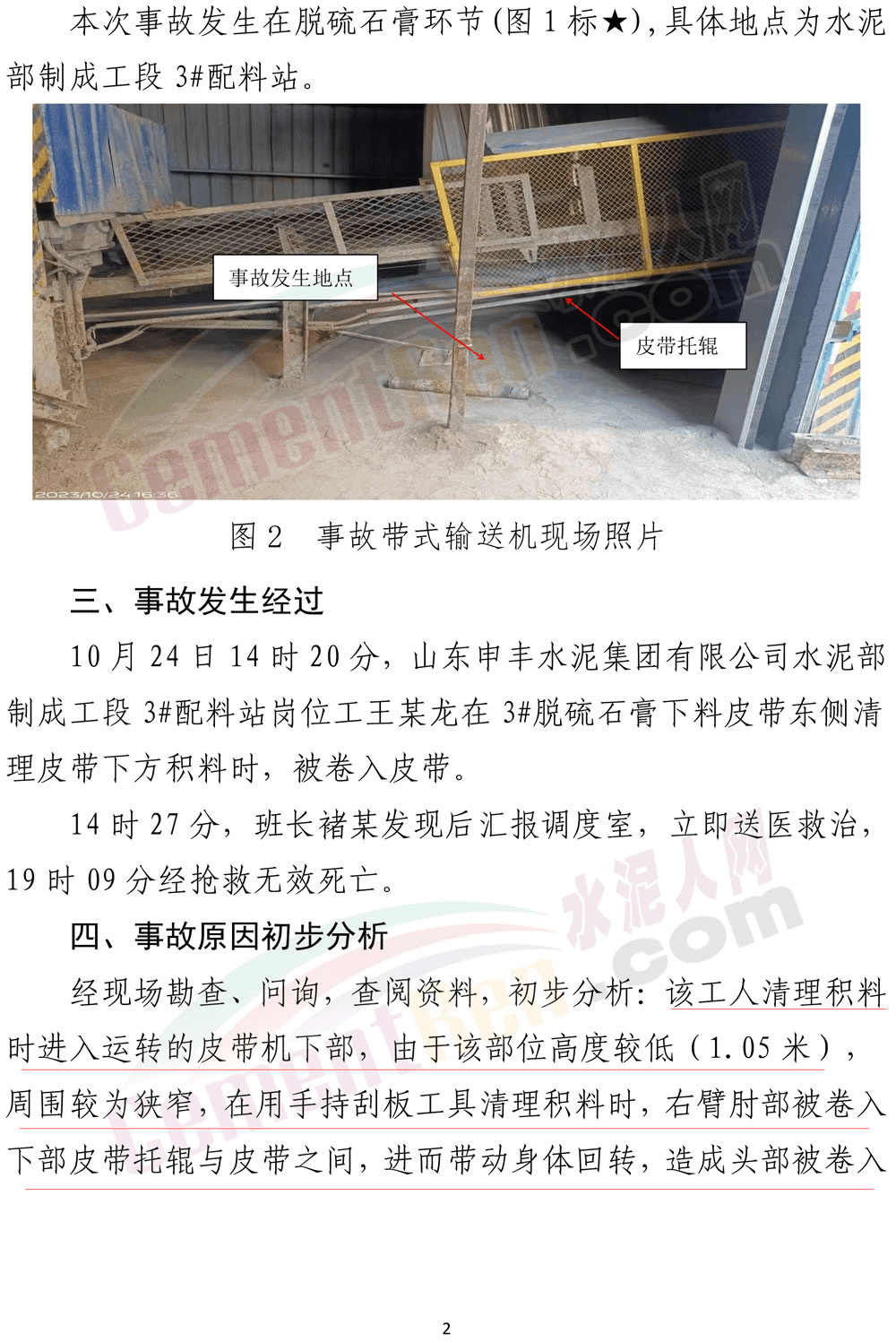 2023年10月25日,山東省應(yīng)急管理廳發(fā)布了一則《事故警示》。其中提到:10月24日14時20分,山東申豐水泥集團(tuán)有限公司水泥部制成工段3#配料站崗位工王某龍,在3#脫硫石膏下料皮帶東側(cè)清理皮帶下方積料時,被卷入皮帶。14時27分,班長褚某發(fā)現(xiàn)后匯報調(diào)度室,立即送醫(yī)救治,19時9分經(jīng)搶救無效死亡。
