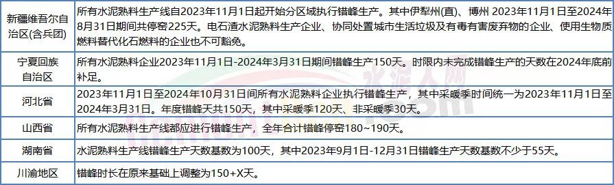 近期,新疆、寧夏等多地公布了2023-2024年錯(cuò)峰生產(chǎn)計(jì)劃。水泥人網(wǎng)注意到,各區(qū)域的停產(chǎn)時(shí)間明顯延長(zhǎng),停產(chǎn)要求明顯加嚴(yán)。