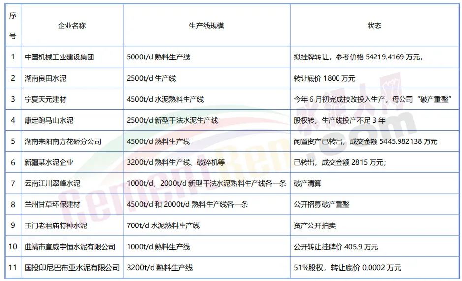 與此同時(shí),多家水泥企業(yè)股權(quán)、指標(biāo)、設(shè)備資產(chǎn)登上拍賣(mài)平臺(tái)。其中不乏2500t/d及以上規(guī)格熟料生產(chǎn)線,甚至還包含5000t/d生產(chǎn)線。