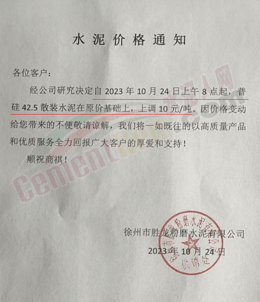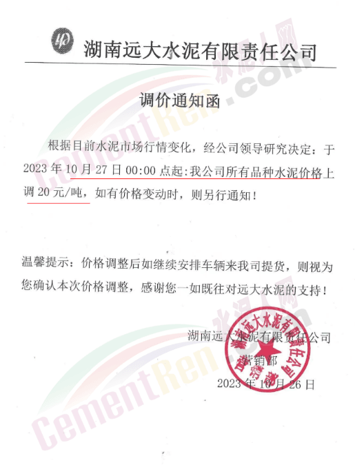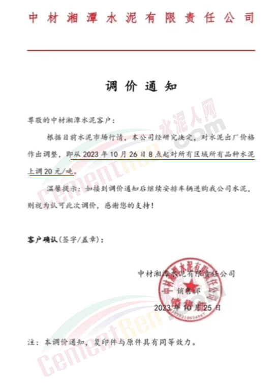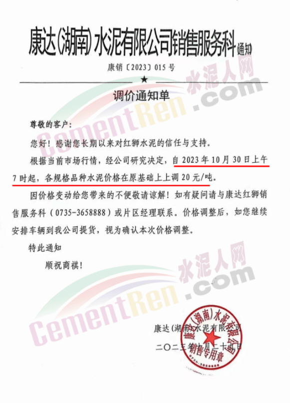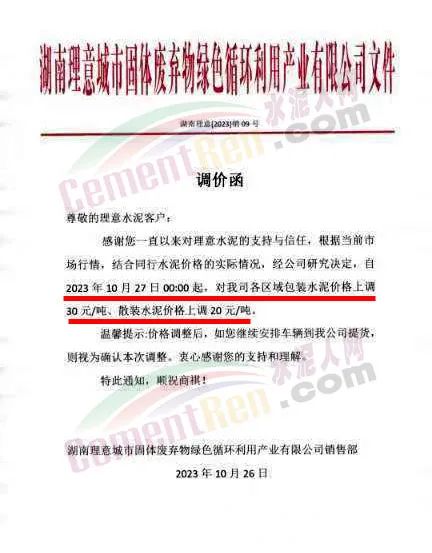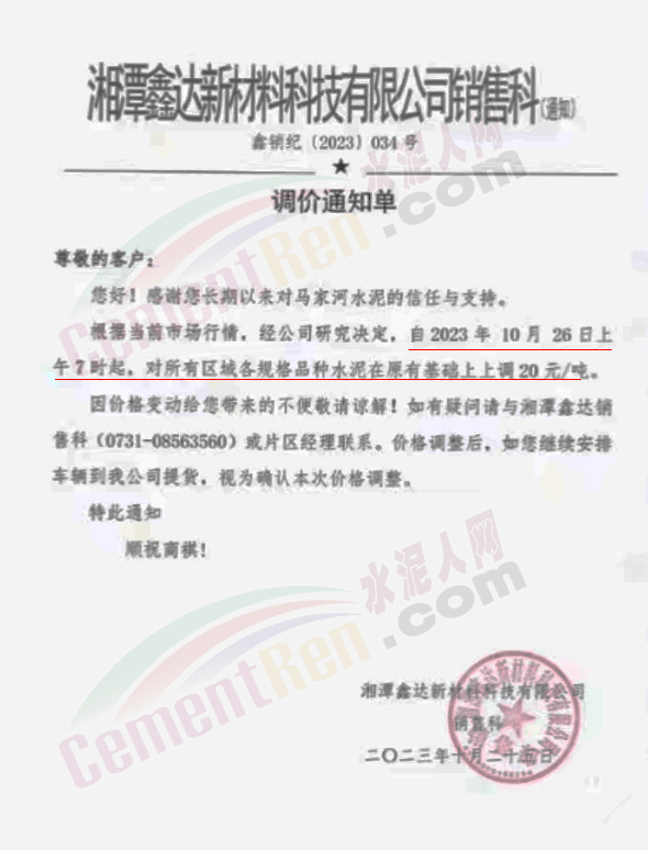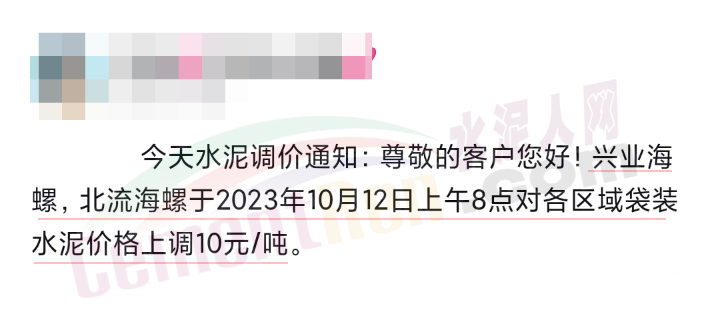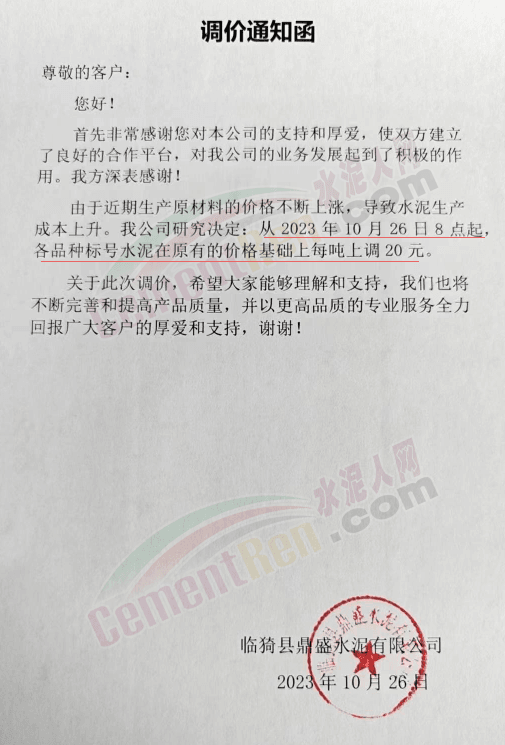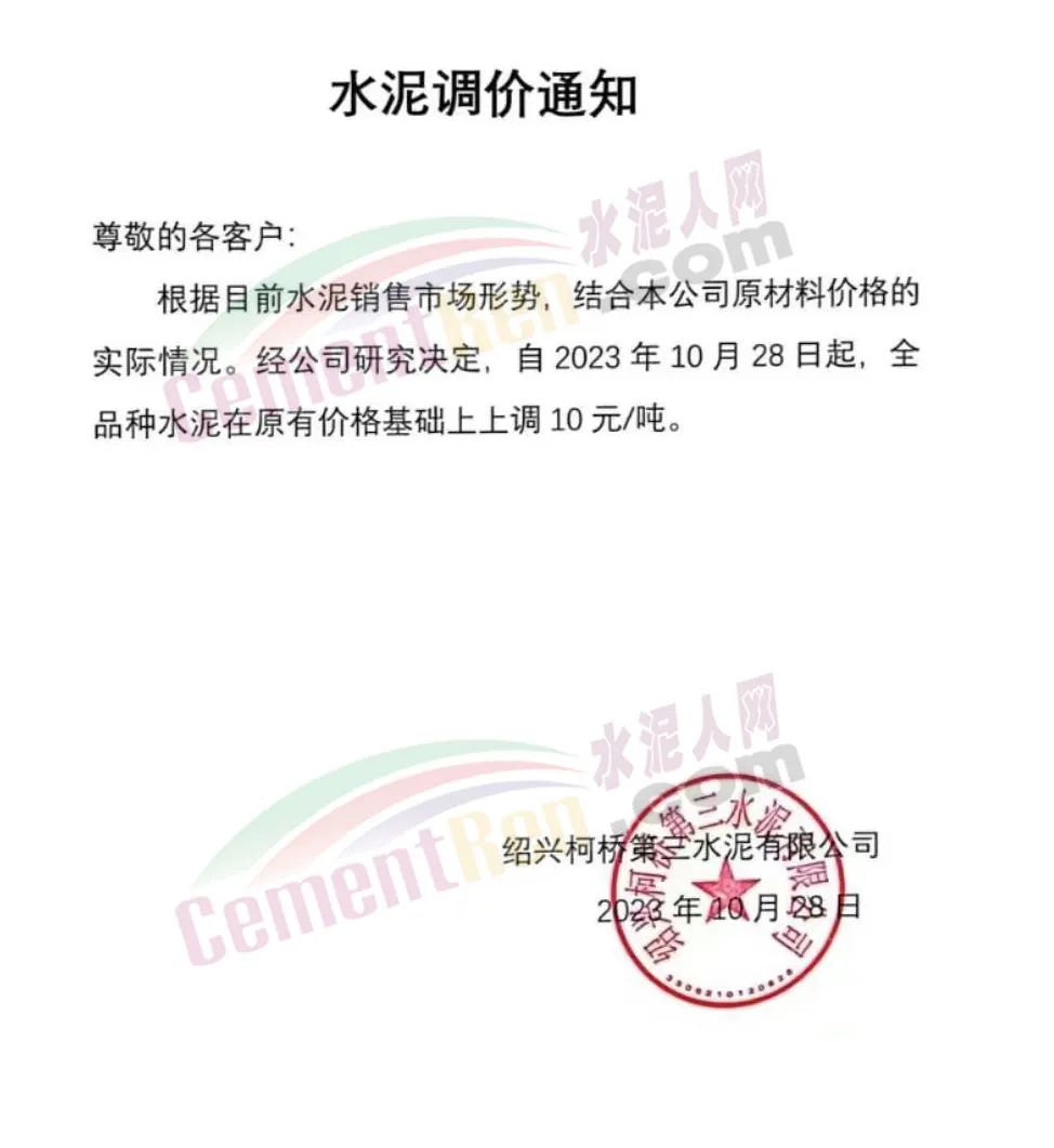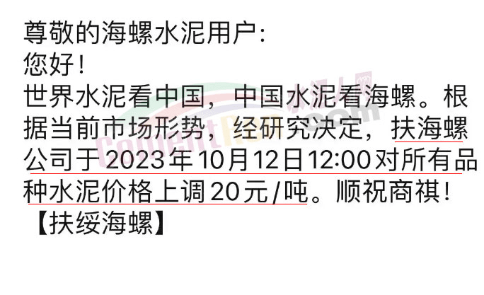 近來(lái)受原材料價(jià)格上漲和經(jīng)濟(jì)政策的刺激,廣東、湖南、山西、陜西多地包括海螺水泥在內(nèi)的多家品牌企業(yè)通知上調(diào)報(bào)價(jià)。廣東東莞鵬潤(rùn)建材有限公司通知,根據(jù)目前的市場(chǎng)情況,從10月26日8時(shí)起公司供應(yīng)的海螺全品項(xiàng)散裝水泥上調(diào)20元/噸。