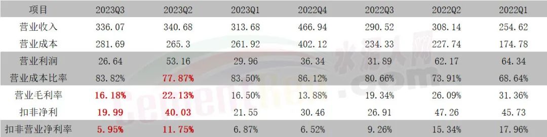 從前三季度來(lái)看,無(wú)論是銷售毛利率還是扣非凈利率,二季度表現(xiàn)最好,單季銷售毛利率22.13%,扣非凈利率11.75%,這與二季度水泥價(jià)格維持、煤炭?jī)r(jià)格下行相關(guān),但三季度水泥價(jià)格下行,煤炭?jī)r(jià)格上漲,擠壓之下三季度單季銷售毛利率16.18%,營(yíng)業(yè)凈利率5.95%,為近幾年單季度的最低值。按照當(dāng)前的水泥、煤炭?jī)r(jià)格走勢(shì)來(lái)看,四季度也難言樂(lè)觀。