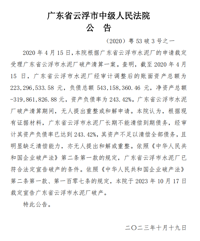 資產(chǎn)負債率為243.42%,云浮水泥廠宣告破產(chǎn)