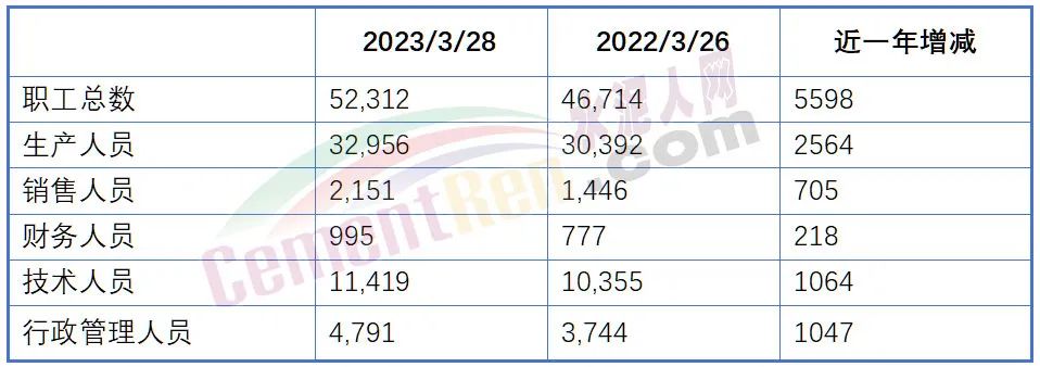 從海螺上市公司數(shù)據(jù)可見,海螺水泥員工人數(shù)已達(dá)52312人,較2022年新增5598人,前三季度人均創(chuàng)利16.58萬元。近一年來,海螺水泥生產(chǎn)人員增加達(dá)2564人,技術(shù)及行政管理人員增加超千人。