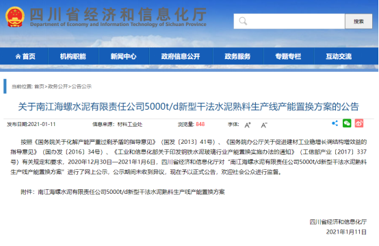 據(jù)查,早在2021年1月11日,四川省經(jīng)信廳網(wǎng)站曾發(fā)布南江海螺水泥5000t/d新型干法熟料生產(chǎn)線產(chǎn)能置換項目方案,將退出四川南威水泥2500t/d、四川成實天鷹水泥2500t/d、四川峨眉山西南水泥嘉華分公司2000t/d三條生產(chǎn)線,減量置換建設(shè)一條5000t/d生產(chǎn)線。