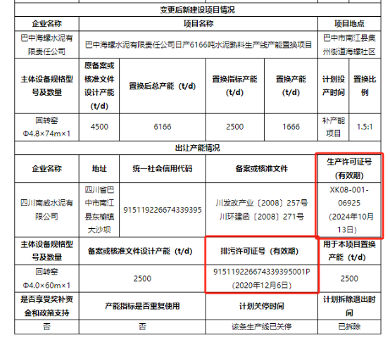 本次置換方案中,出讓方四川南威水泥有限公司生產(chǎn)許可證有效期至2024年10月13日,排污許可證有效期至2020年12月6日,截至本次變更方案公示,四川南威水泥有限公司生產(chǎn)許可證已過期5個月,排污許可證過期已超過4年。