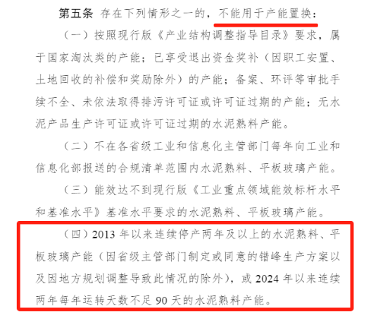 現(xiàn)行置換辦法第二章第五條規(guī)定:2013年以來連續(xù)停產(chǎn)兩年及以上的水泥熟料、平板玻璃產(chǎn)能(因省級主管部門制定或同意的錯峰生產(chǎn)方案以及因地方規(guī)劃調(diào)整導致此情況的除外),或2024年以來連續(xù)兩年每年運轉(zhuǎn)天數(shù)不足90天的水泥熟料產(chǎn)能。不能用于產(chǎn)能置換。