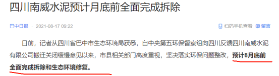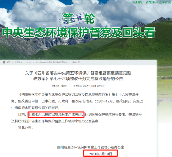 根據(jù)四川省生態(tài)環(huán)境保護督察工作領(lǐng)導小組辦公室2021年3月11日發(fā)布的關(guān)于【《四川省落實中央第五環(huán)境保護督察組督察反饋意見整改方案》第七十六項整改任務(wù)完成整改銷號的公告】顯示,截至2021年3月10日,南威水泥已按時完成現(xiàn)有生產(chǎn)線關(guān)閉,達到環(huán)境保護整改銷號要求。