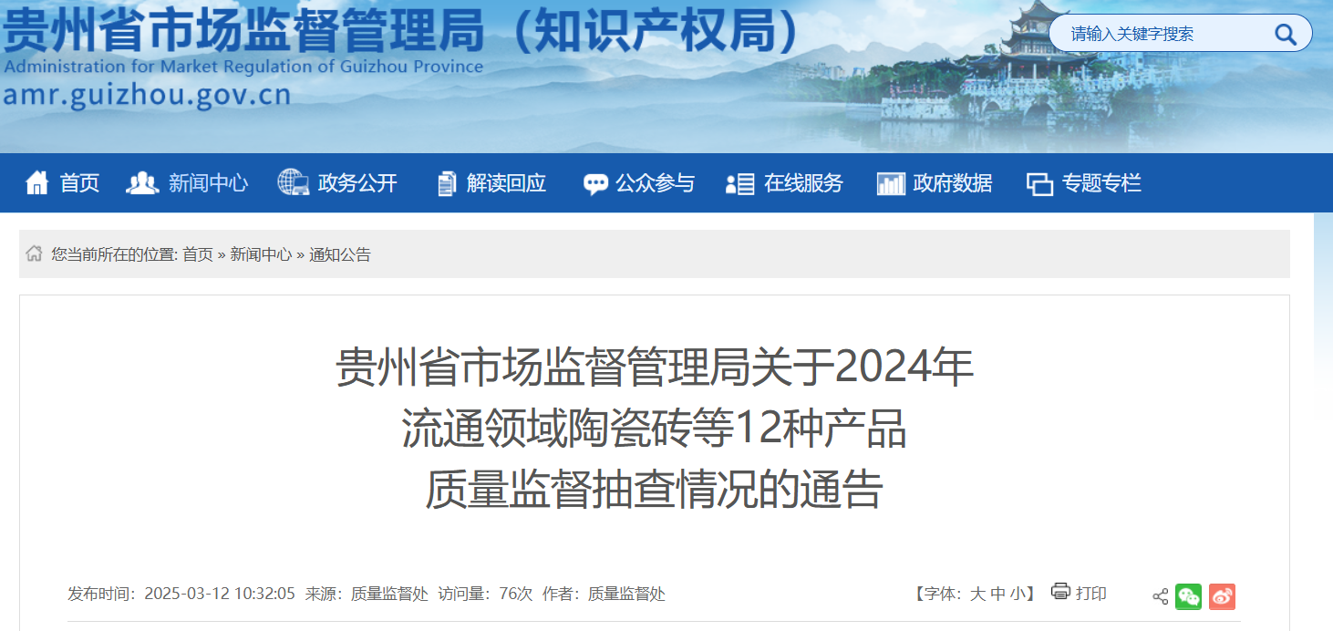 日前,貴州省市場監(jiān)督管理局發(fā)布《關于2024年流通領域陶瓷磚等12種產品