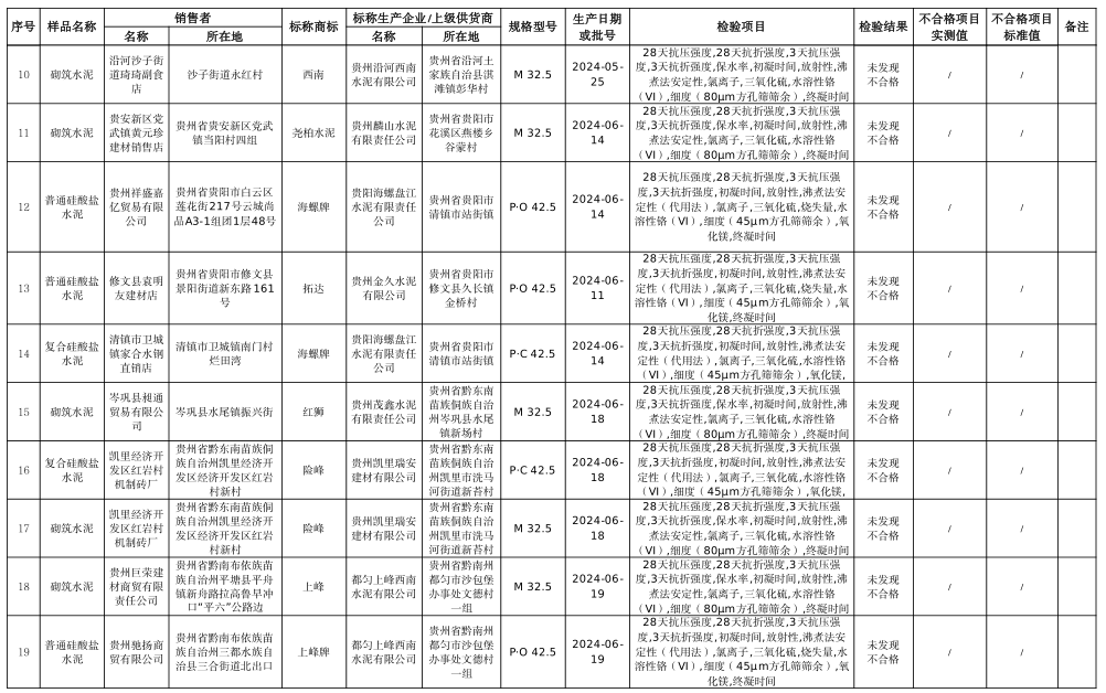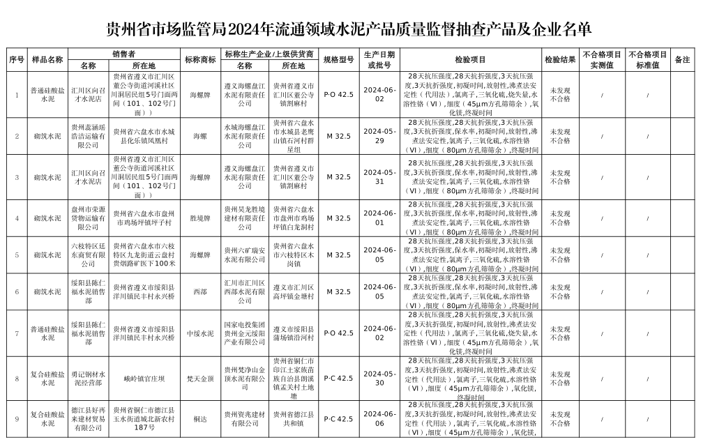 本次共對26家銷售者銷售的30批次水泥產品開展了監(jiān)督抽查,,抽查區(qū)域為貴陽市、遵義市、六盤水市、安順市、畢節(jié)市、銅仁市、黔東南州、黔南州、黔西南州。本次監(jiān)督抽查依據GB 175-2023《通用硅酸鹽水泥》等標準進行檢驗。經檢驗,未發(fā)現(xiàn)不合格產品。水泥人網注意到上述抽查的30批次水泥全部來自于流通領域。涉及水泥品牌包含海螺、西南、紅獅、潤豐、臺泥、堯柏、上峰、西部等。抽查水泥品種為普通硅酸鹽水泥、復合硅酸鹽水泥、砌筑水泥三類,其中P.C和P.O水泥抽查標號為42.5.砌筑水泥抽查標號為32.5.