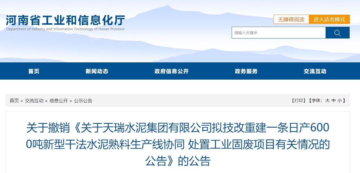 近日,河南工信廳發(fā)布關(guān)于撤銷《關(guān)于天瑞水泥集團(tuán)有限公司擬技改重建一條日產(chǎn)6000噸新型干法水泥熟料生產(chǎn)線協(xié)同 處置工業(yè)固廢項(xiàng)目有關(guān)情況的公告》的公告稱: