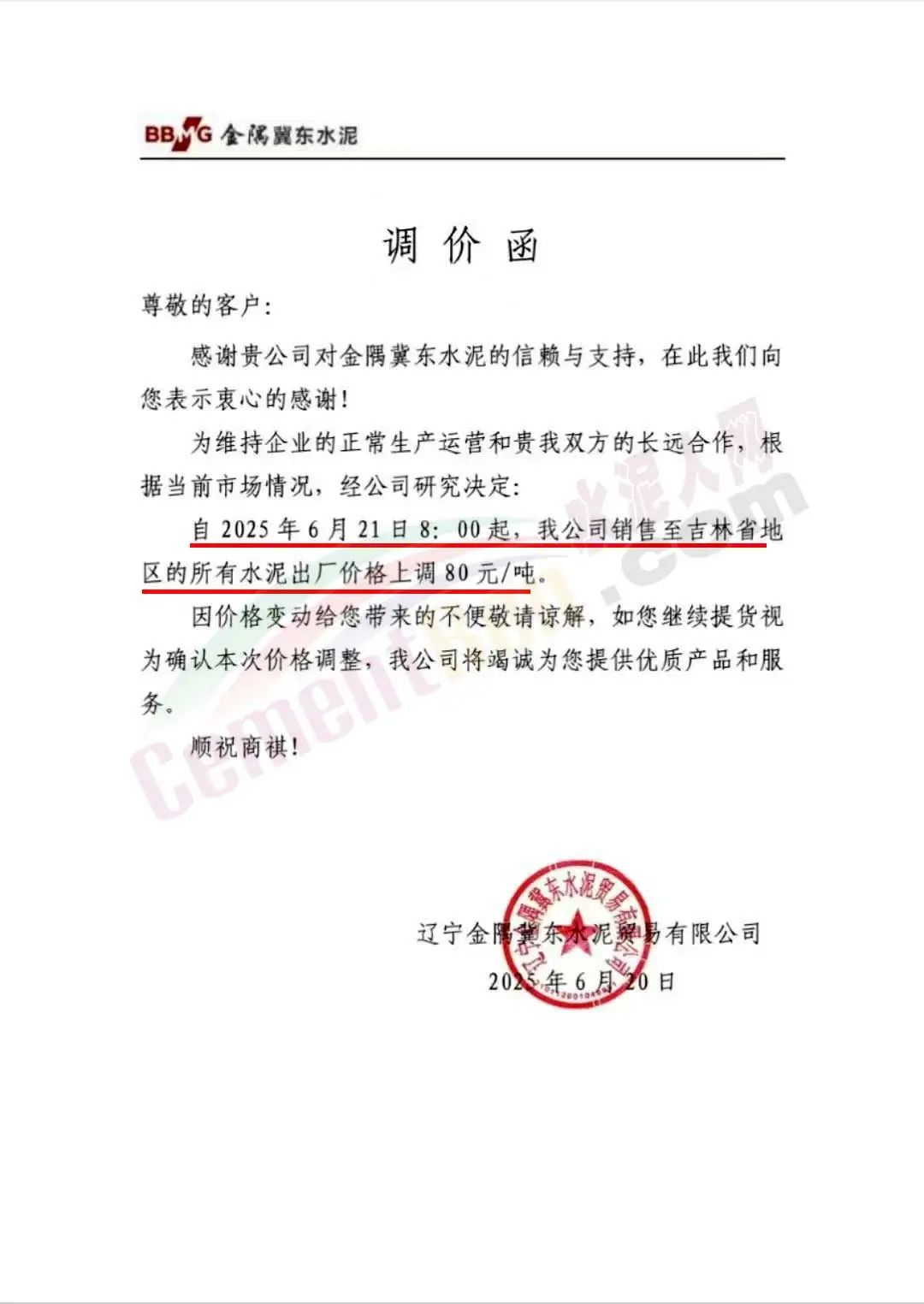 遼寧金隅冀東水泥貿(mào)易有限公司通知稱(chēng),為維持企業(yè)的正常生產(chǎn)運(yùn)營(yíng),根據(jù)當(dāng)前市場(chǎng)情況,經(jīng)公司研究決定,自2025年6月21日8時(shí)起,公司銷(xiāo)售至吉林省地區(qū)的所有水泥出廠(chǎng)價(jià)格上調(diào)80元/噸。