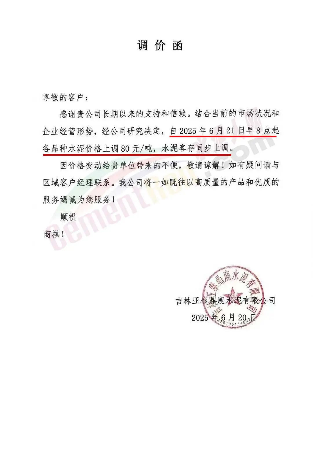 吉林亞泰鼎鹿水泥有限公司通知,結(jié)合當(dāng)前的市場(chǎng)狀況和企業(yè)經(jīng)營(yíng)形勢(shì),經(jīng)公司研究決定,自2025年6月21日早8點(diǎn)起各品種水泥價(jià)格上調(diào)80元/噸,水泥客存同步上調(diào)。