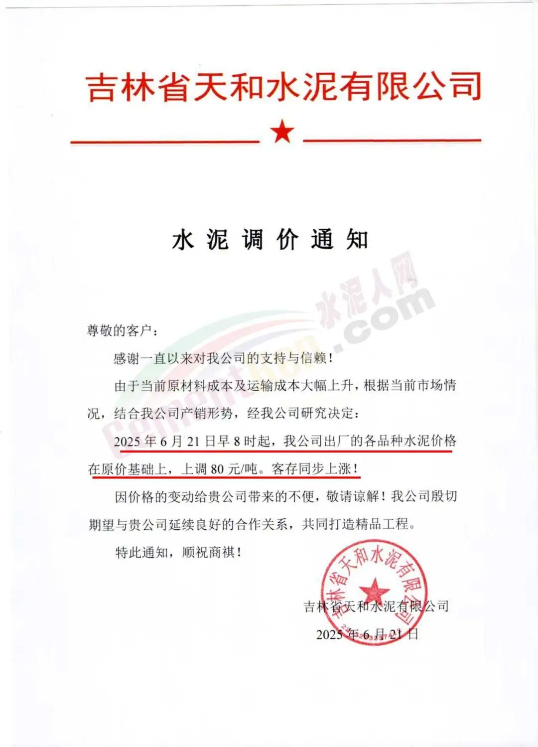 吉林天和水泥通知,自6月21日起,公司出廠(chǎng)的各品種水泥價(jià)格在原價(jià)基礎(chǔ)上上調(diào)80元/噸,客存同步上漲。