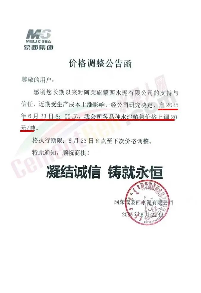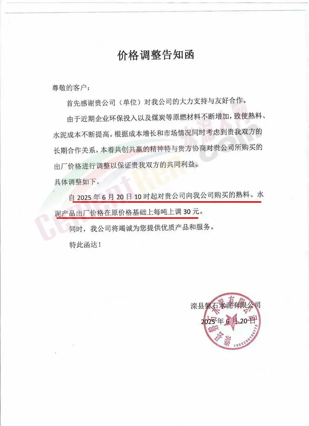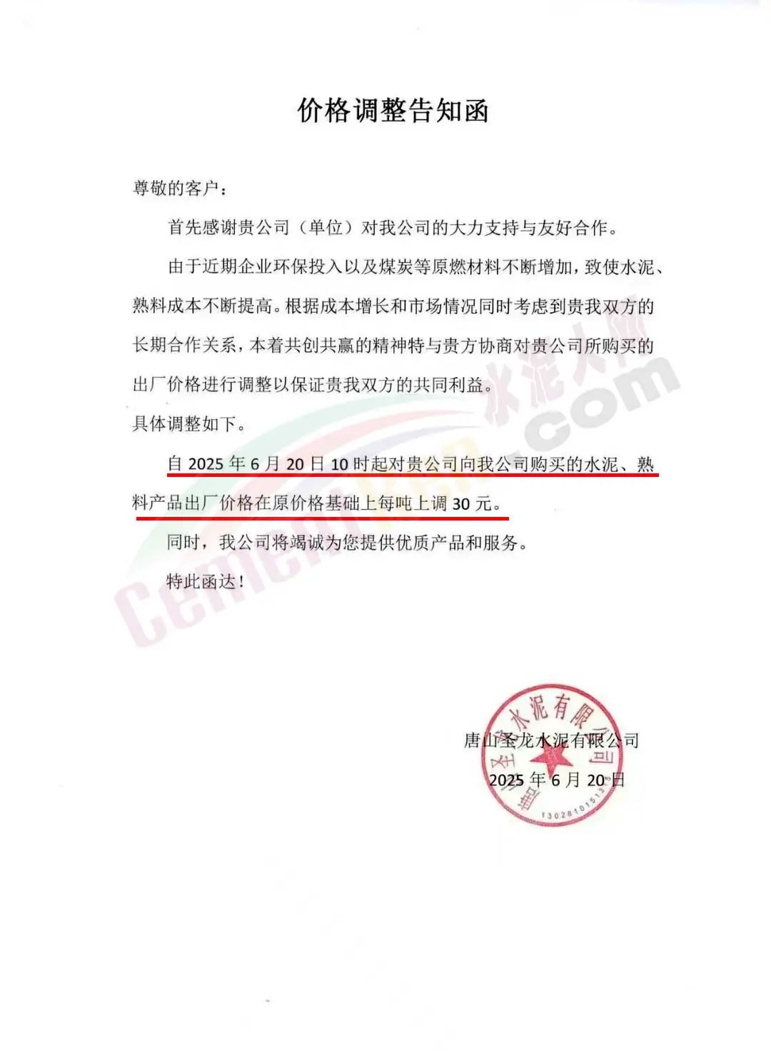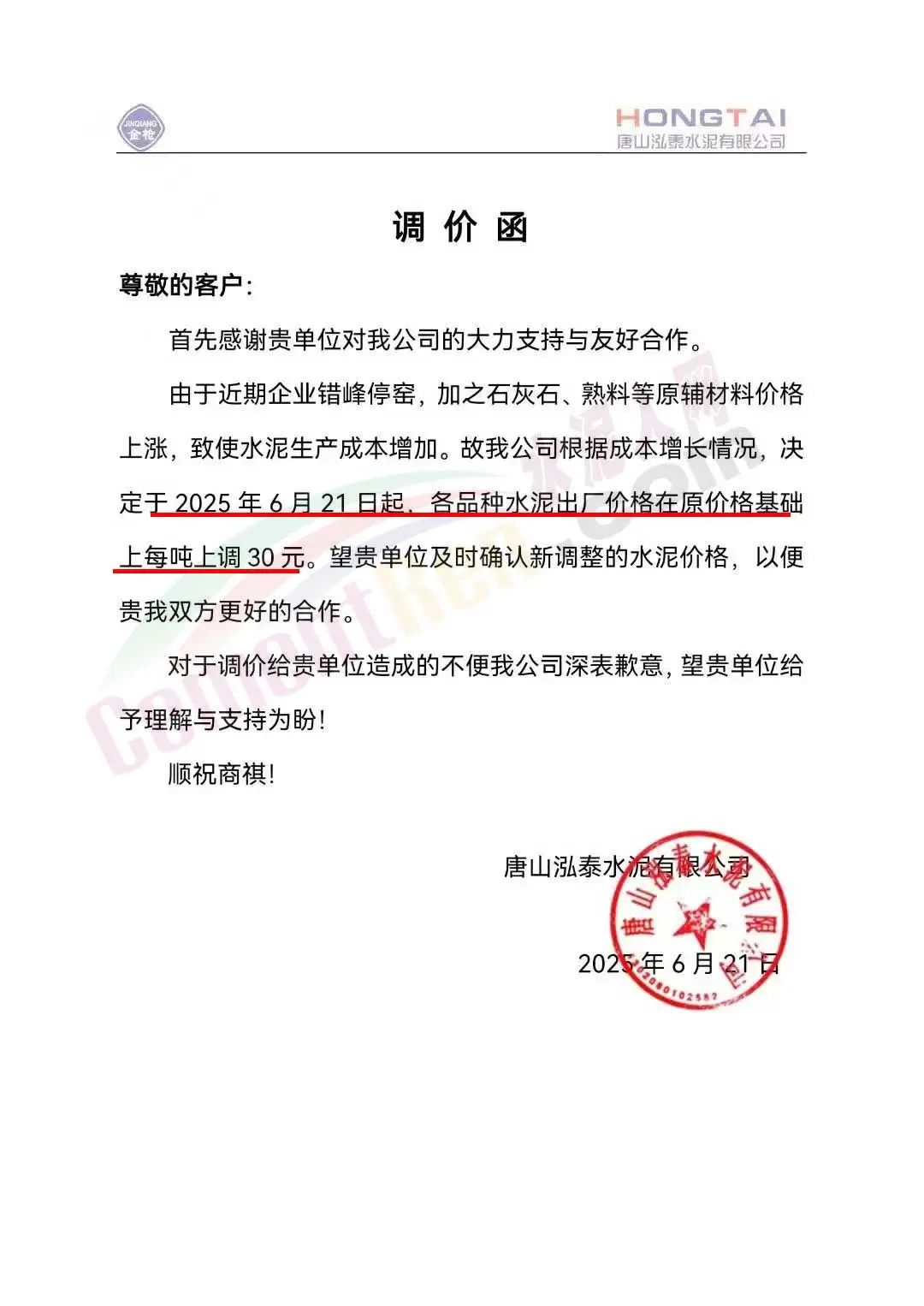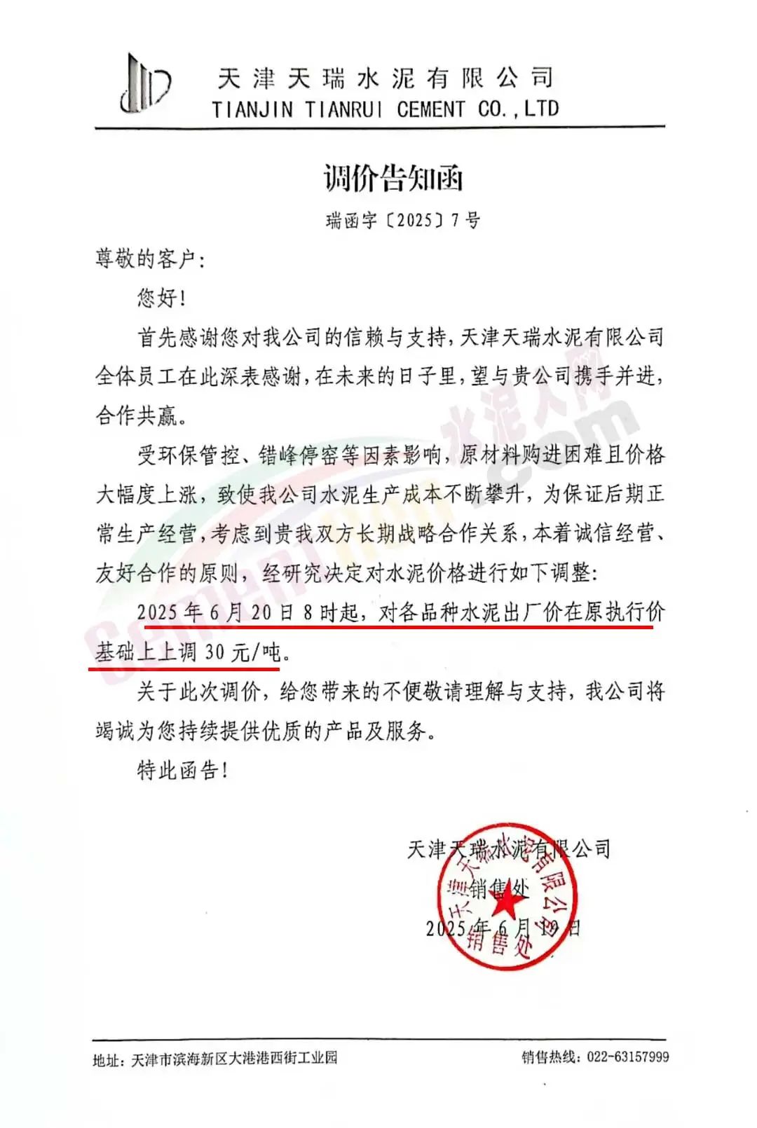 天津天瑞水泥有限公司通知,受環(huán)保管控、錯(cuò)峰停窯等因素影響,原材料購(gòu)進(jìn)困難且價(jià)格大幅度上漲,致使公司水泥生產(chǎn)成本不斷攀升,為保證后期正常生產(chǎn)經(jīng)營(yíng),經(jīng)研究決定2025年6月20日8時(shí)起,對(duì)各品種水泥出廠(chǎng)價(jià)在原執(zhí)行價(jià)基礎(chǔ)上上調(diào)30元/噸。
