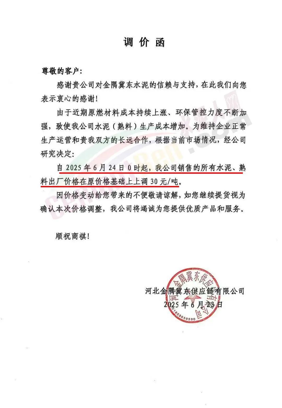 河北金隅冀東供應(yīng)鏈有限公司通知,近期原燃材料成本持續(xù)上漲、環(huán)保管控力度不斷加強(qiáng),致使我公司水泥(熟料)生產(chǎn)成本增加。為維持企業(yè)正常生產(chǎn)運(yùn)營(yíng)和貴我雙方的長(zhǎng)遠(yuǎn)合作,根據(jù)當(dāng)前市場(chǎng)情況,經(jīng)公司研究決定:自2025年6月24日0時(shí)起,公司銷(xiāo)售的所有水泥、熟料出廠(chǎng)價(jià)格在原價(jià)格基礎(chǔ)上上調(diào)30元/噸。