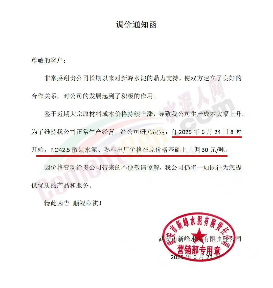 武安市新峰水泥有限責(zé)任公司通知,鑒于近期大宗原材料成本價(jià)格持續(xù)上漲,導(dǎo)致公司生產(chǎn)成本大幅上升,為了維持公司正常生產(chǎn)經(jīng)營(yíng),經(jīng)公司研究決定:自2025年6月24日8時(shí)開(kāi)始,P.O42.5散裝水泥、熟料出廠(chǎng)價(jià)格在原價(jià)格基礎(chǔ)上上調(diào)30元/噸。