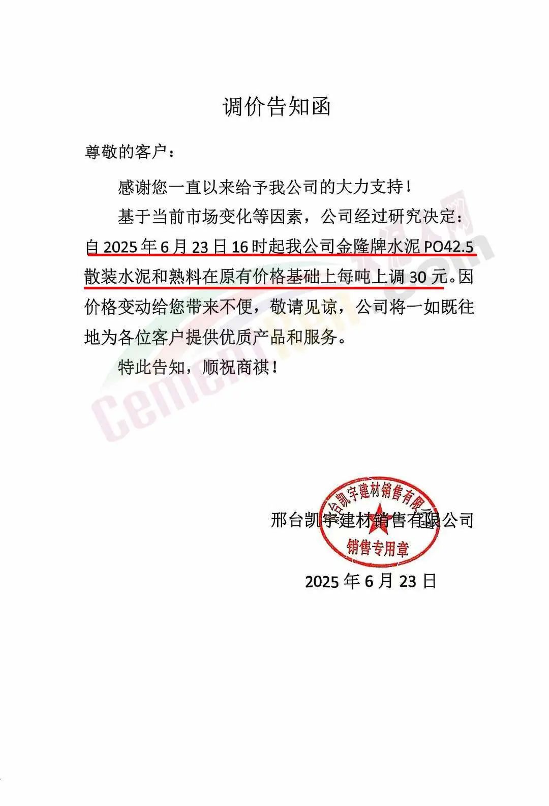 邢臺(tái)凱宇建材銷(xiāo)售有限公司通知,基于當(dāng)前市場(chǎng)變化等因素,公司經(jīng)過(guò)研究決定:自2025年6月23日16時(shí)起公司金隆牌水泥PO42.5散裝水泥和熟料在原有價(jià)格基礎(chǔ)上每噸上調(diào)30元。