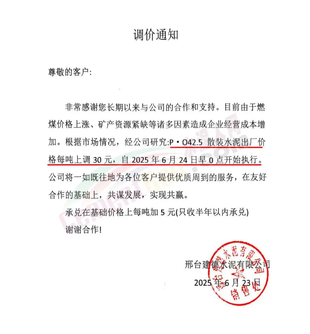 沙河市雙基水泥有限公司通知,經(jīng)公司研究決定自2025年6月24日上午8時(shí)起,P042.5散裝水泥及熟料出廠(chǎng)價(jià)格上調(diào)30元/噸。