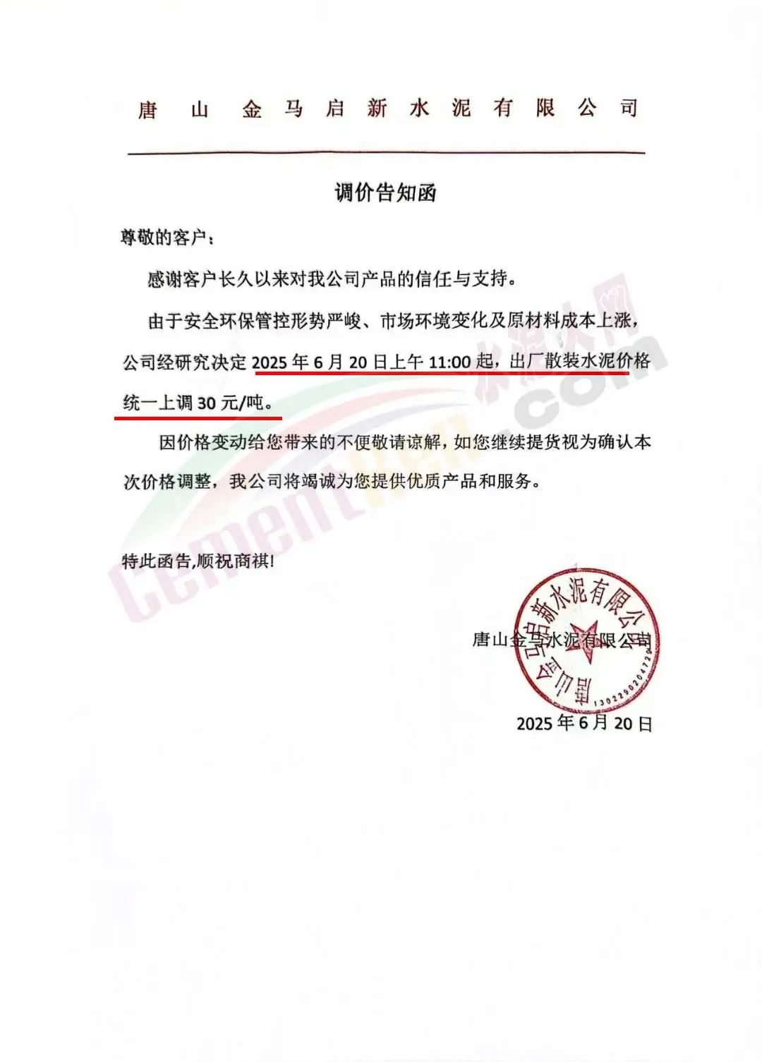 唐山金馬水泥有限公司通知,由于安全環(huán)保管控形勢(shì)嚴(yán)峻、市場(chǎng)環(huán)境變化及原材料成本上漲:公司經(jīng)研究決定2025年6月20日上午11:00起,出廠(chǎng)散裝水泥價(jià)格統(tǒng)一上調(diào)30元/噸。
