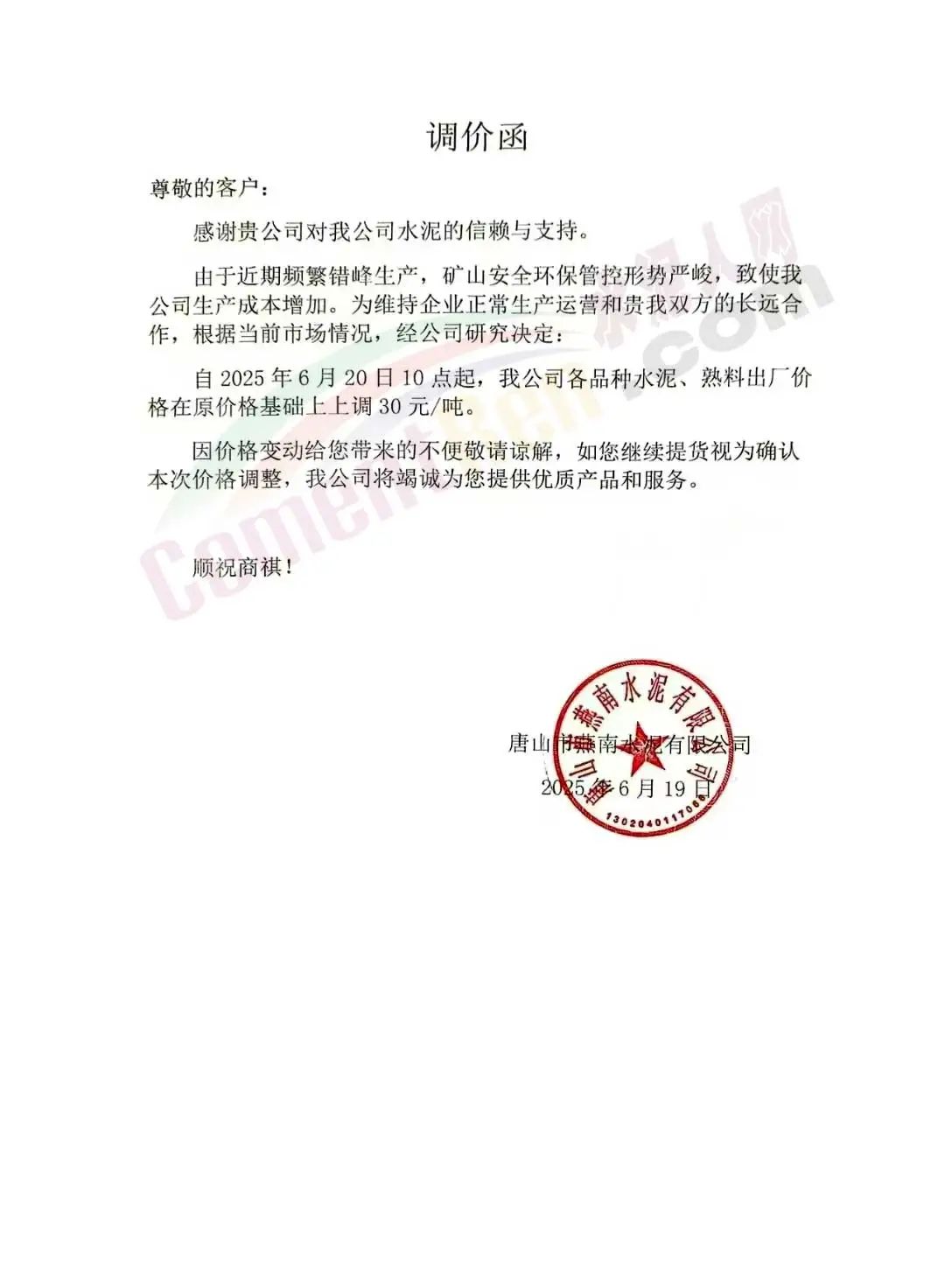 唐山市燕南水泥有限公司通知,由于近期頻繁錯(cuò)峰生產(chǎn),礦山安全環(huán)保管控形勢(shì)嚴(yán)峻,致使公司生產(chǎn)成本增加。為維持企業(yè)正常生產(chǎn)運(yùn)營(yíng),根據(jù)當(dāng)前市場(chǎng)情況,經(jīng)公司研究決定:自2025年6月20日10點(diǎn)起,公司各品種水泥、熟料出廠(chǎng)價(jià)格在原價(jià)格基礎(chǔ)上上調(diào)30元/噸。